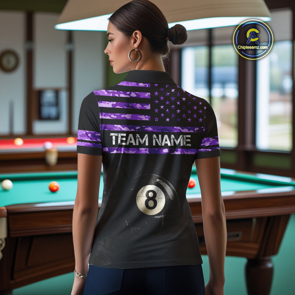 Customized Retro 8 Ball Pool Purple Camo US Flag Billiard Shirt For Women, Patriotic Billiard Jersey TDM4331