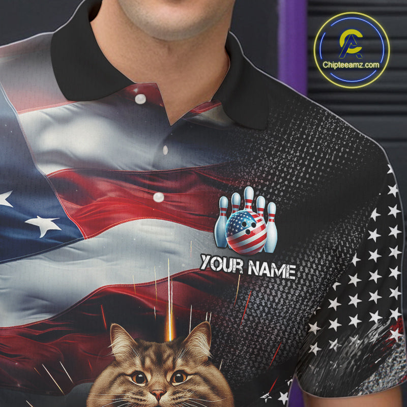 American Flag Funny Cat Bowling Shirt for Men Custom Bowling League Jersey Polo & 1/4 Zip Shirt QZT807
