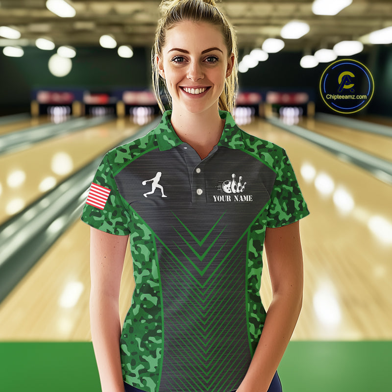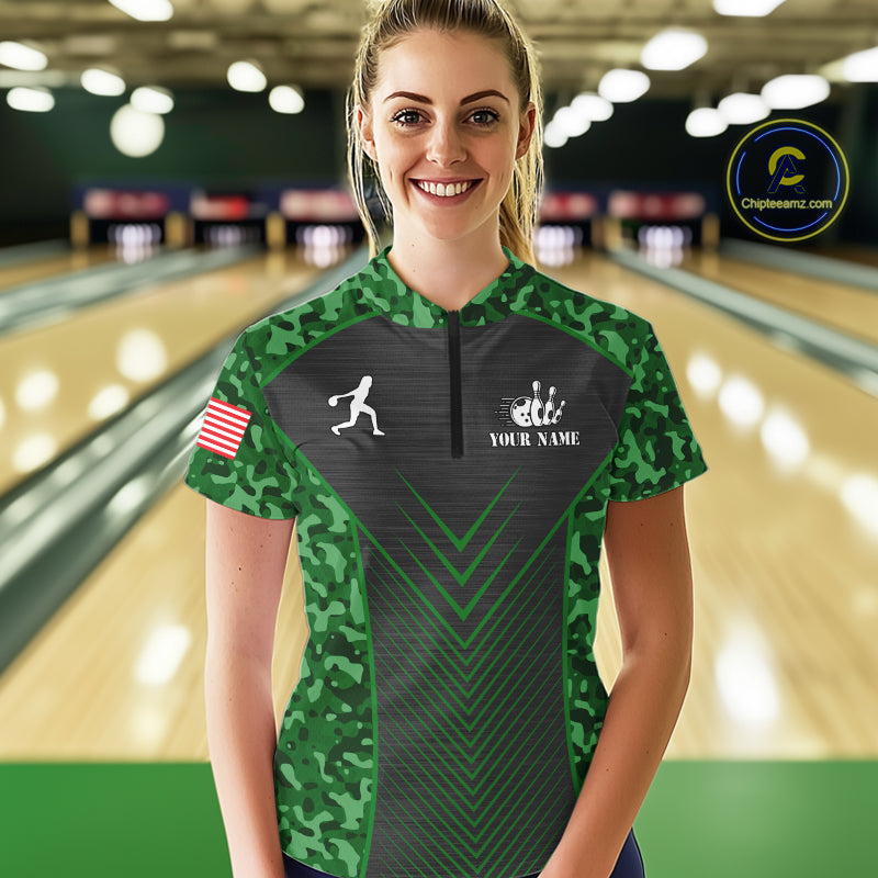 Women Bowling Polo, Quarter Zip Shirts Custom green camo American flag team bowling League Jerseys NQS11117