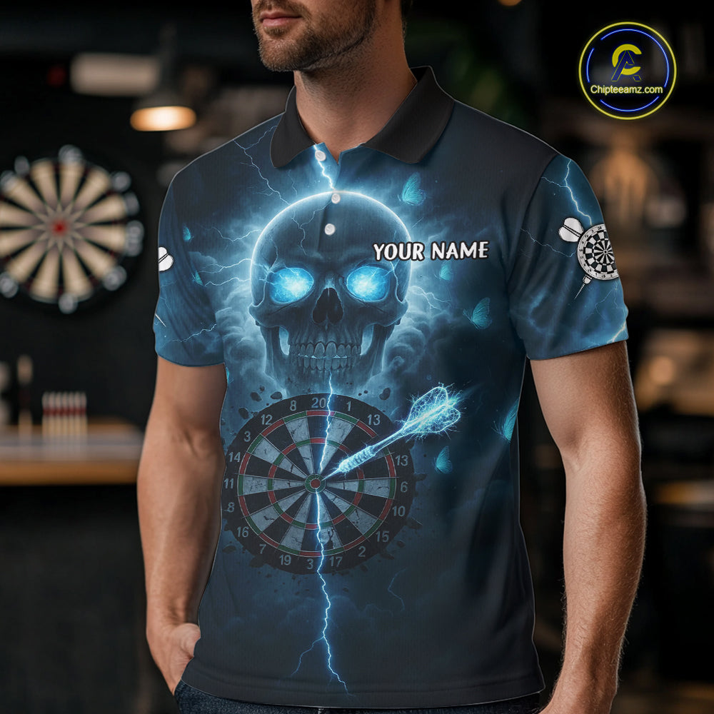 Custom Blue Skull Butterflies Lightning Dartboard Men Darts Polo Shirt, Dart Jerseys NYN1842