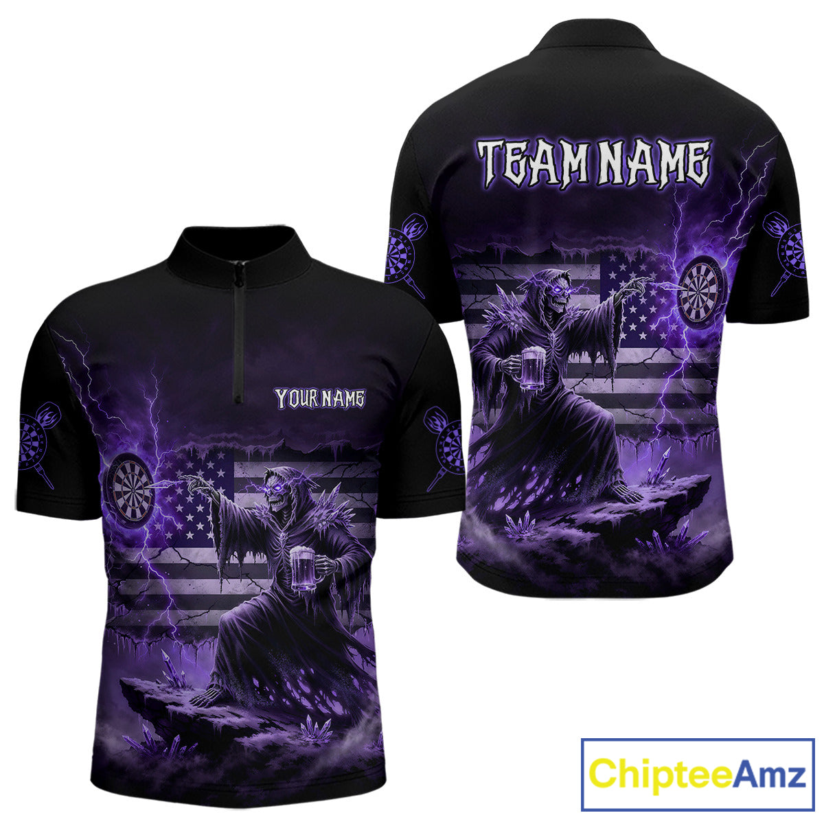 Custom Lightning Purple Grim Reaper Beer Funny Men Darts Quarter-Zip Shirt US Flag Dart Jerseys NYN1837