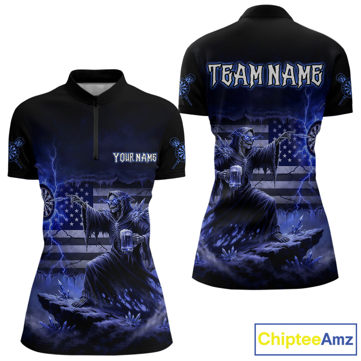 Custom Lightning Blue Grim Reaper Beer Funny Women Darts Quarter-Zip Shirt US Flag Dart Jerseys NYN1838