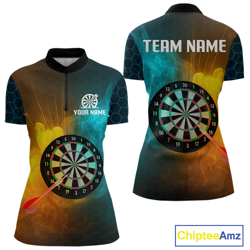 Turquoise & Yellow Smoke Dartboard Darts Shirt For Women - Custom Name & Team Jersey NYN0587