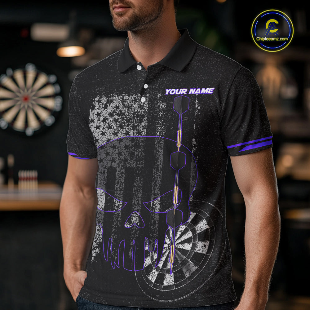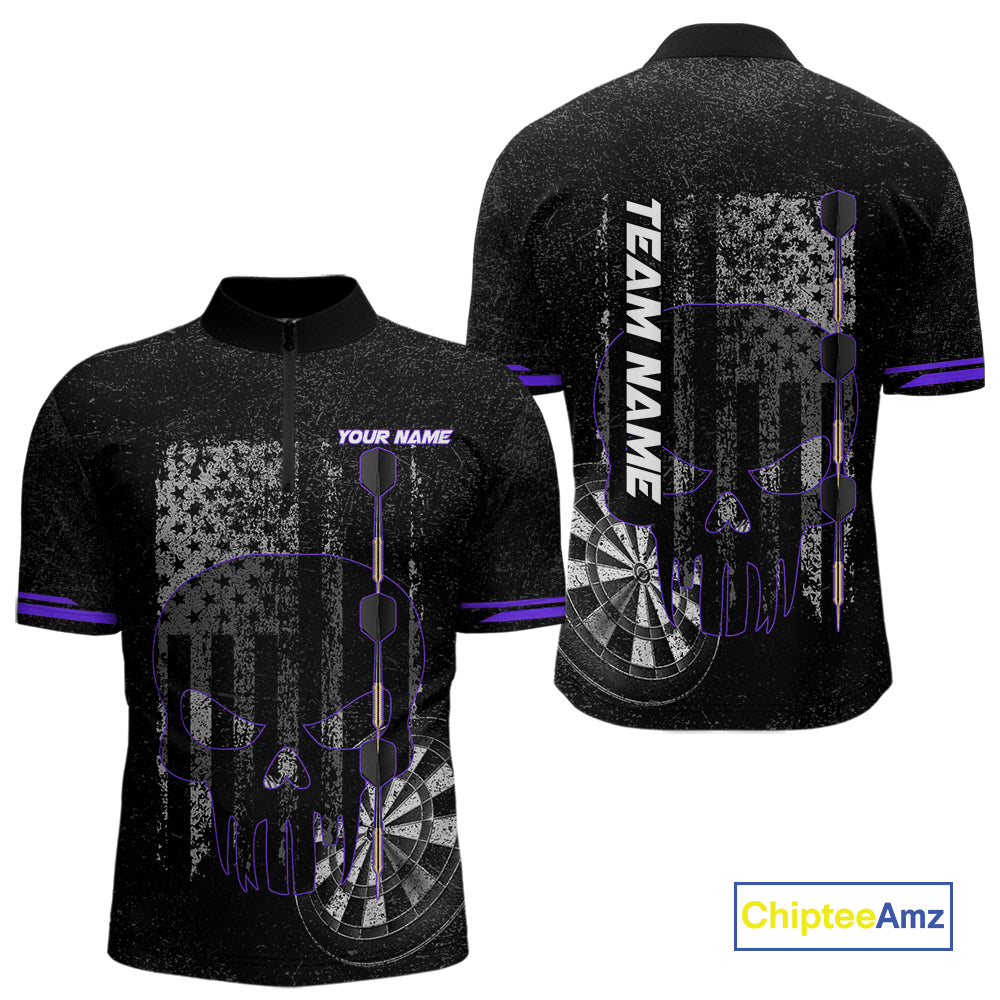 Black & White grunge American Flag Skull Mens Darts Shirt Custom patriotic Team Darts Jersey | Purple NQS10750