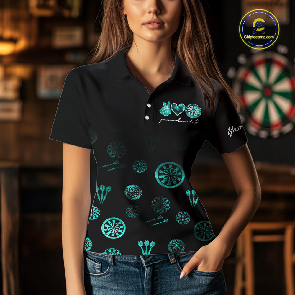 Personalized Turquoise Black Camo Darts Shirts For Women Custom Peace Love Darts Team Jerseys NQS10542
