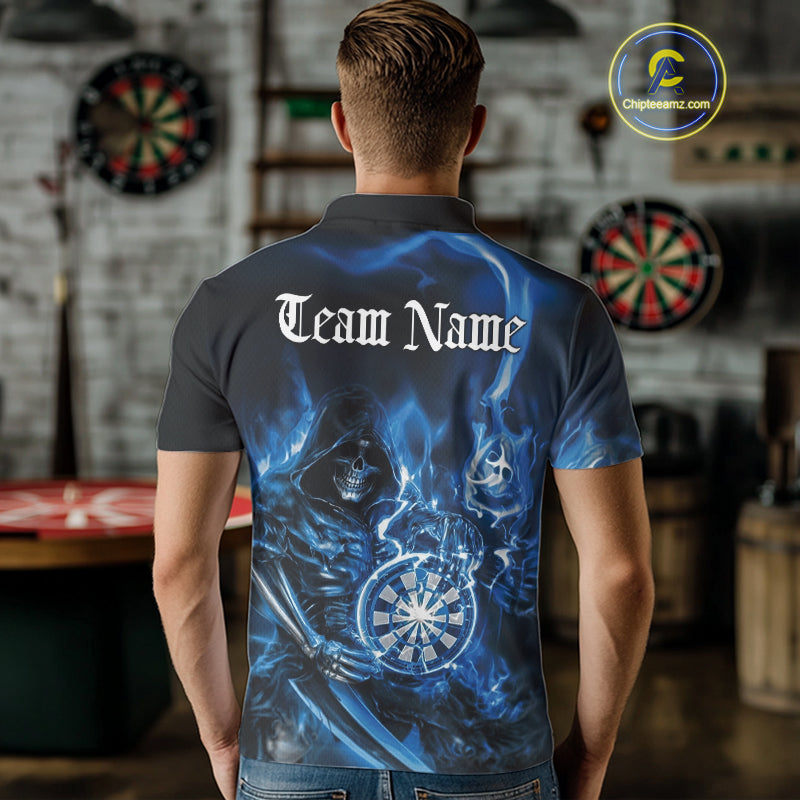 Custom Black And Blue Flame Grim Reaper Dart Team Men Polo Shirts, Halloween Dart Otufit IPHW10026
