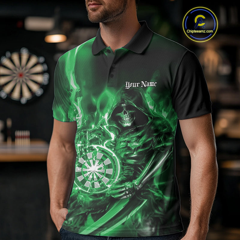 Custom Black And Green Flame Grim Reaper Dart Team Men Polo Shirts, Halloween Dart Otufit IPHW10029