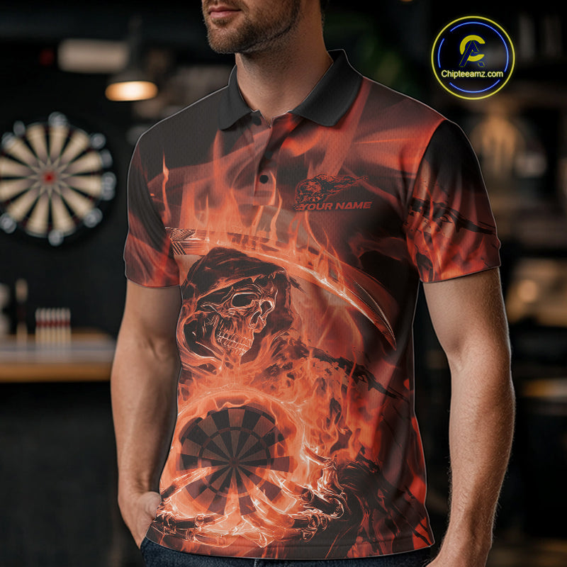 Custom Orange Flame Grim Reaper Halloween Dart Men Polo Shirts For Team, Dart Jerseys IPHW10031