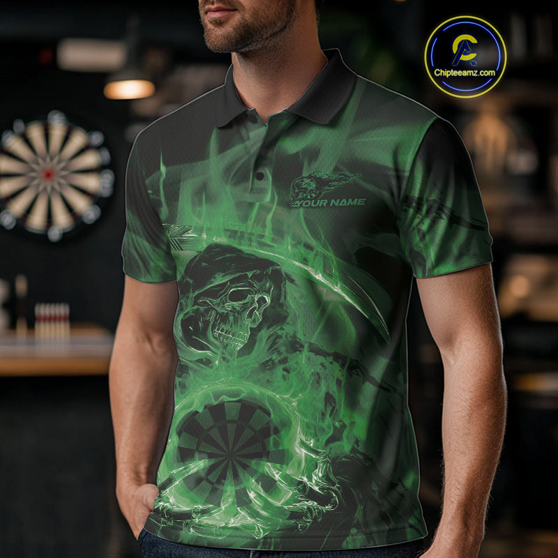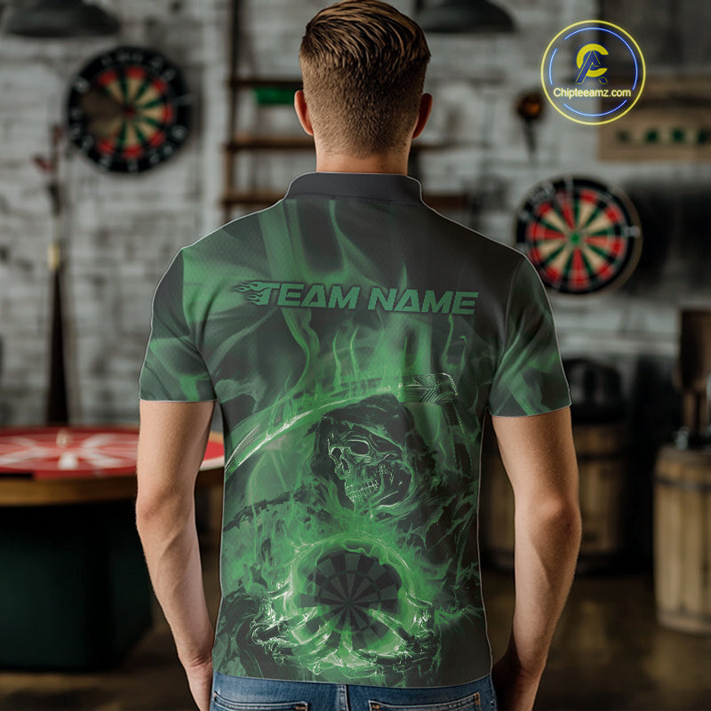 Custom Green Flame Grim Reaper Halloween Dart Men Polo Shirts For Team, Dart Jerseys IPHW10033