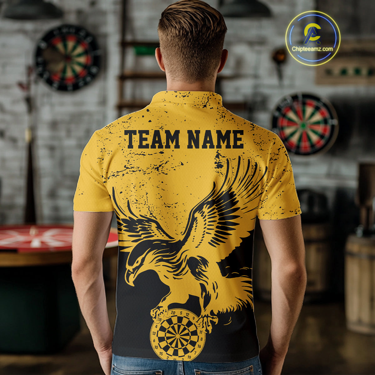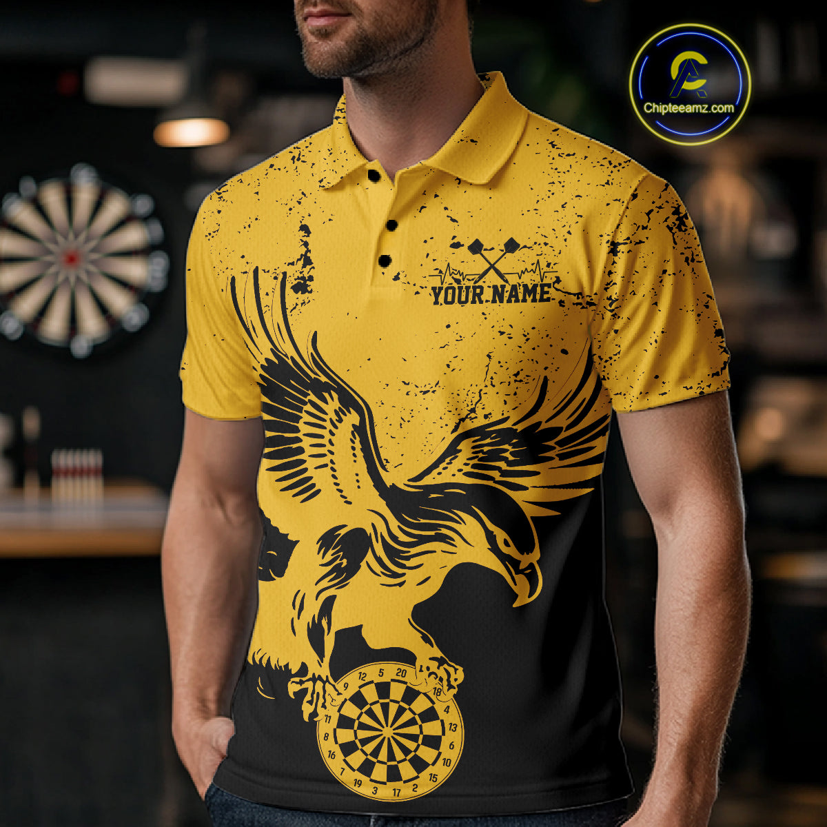 Custom Grunge Yellow Eagle Dart Team Men Polo Shirts, Vintage Dart Uniform Players Outfit IPHW9968