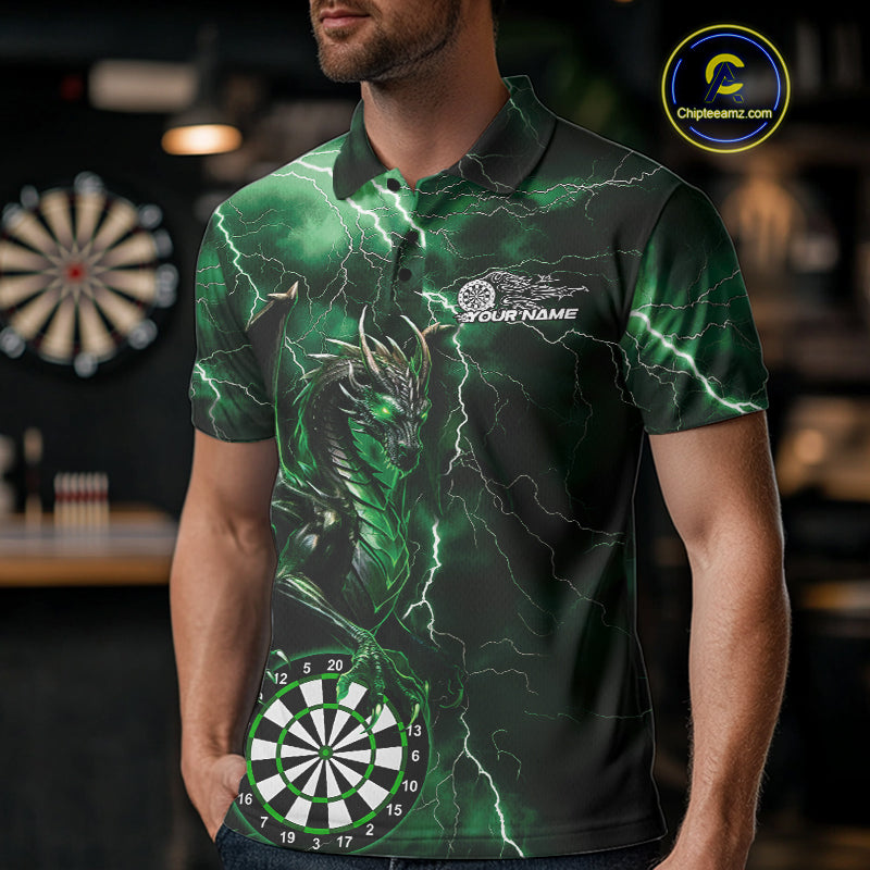 Custom Green Thunder Lightning Dragon Dart Team Polo Shirt For Men, Dart League Shirt IPHW9996