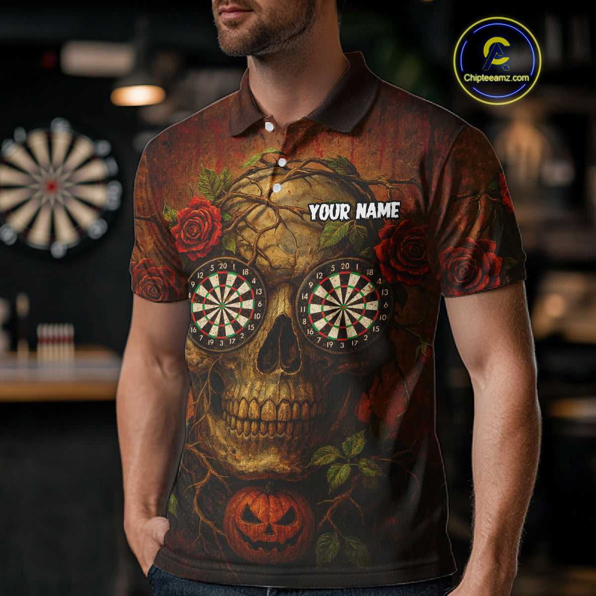 Custom Red Roses Skull Halloween Dart Polo Shirt For Men Grunge Dart Team Jersey NYN1474