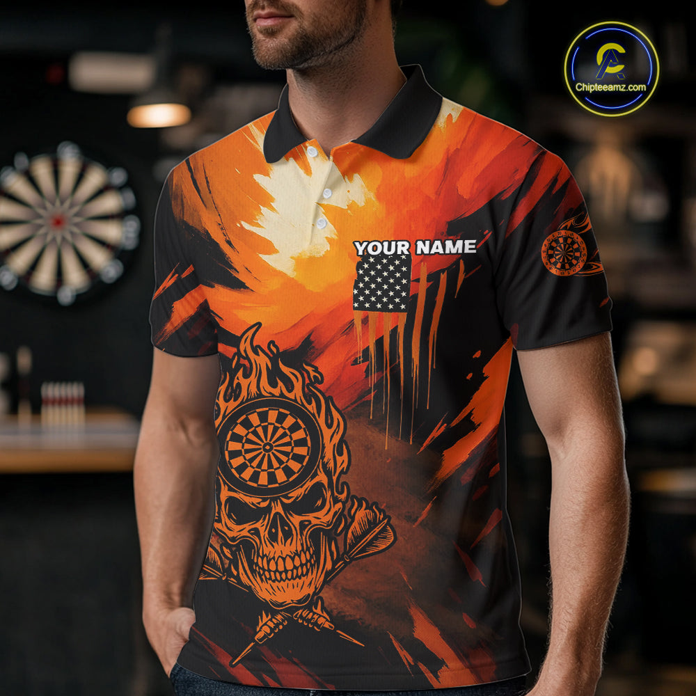 Custom Orange Grunge Skull Dartboard Patriotic Dart Men Polo Jerseys US Flag Dart Shirt NYN1713