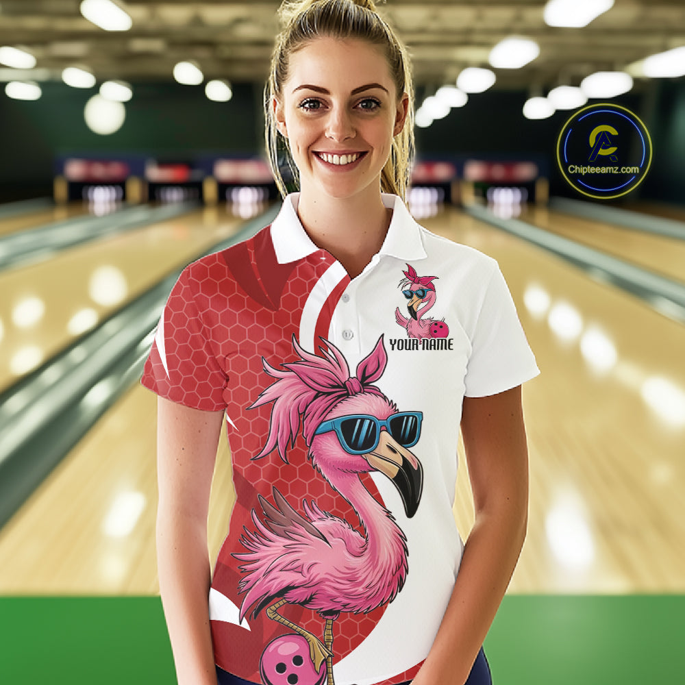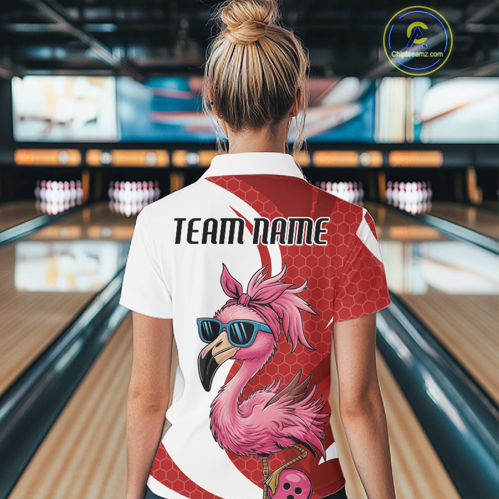 Custom Funny Red Flamingo Bowling Women Polo Shirt, Bowling League Bowlers Outfit IPHW10681
