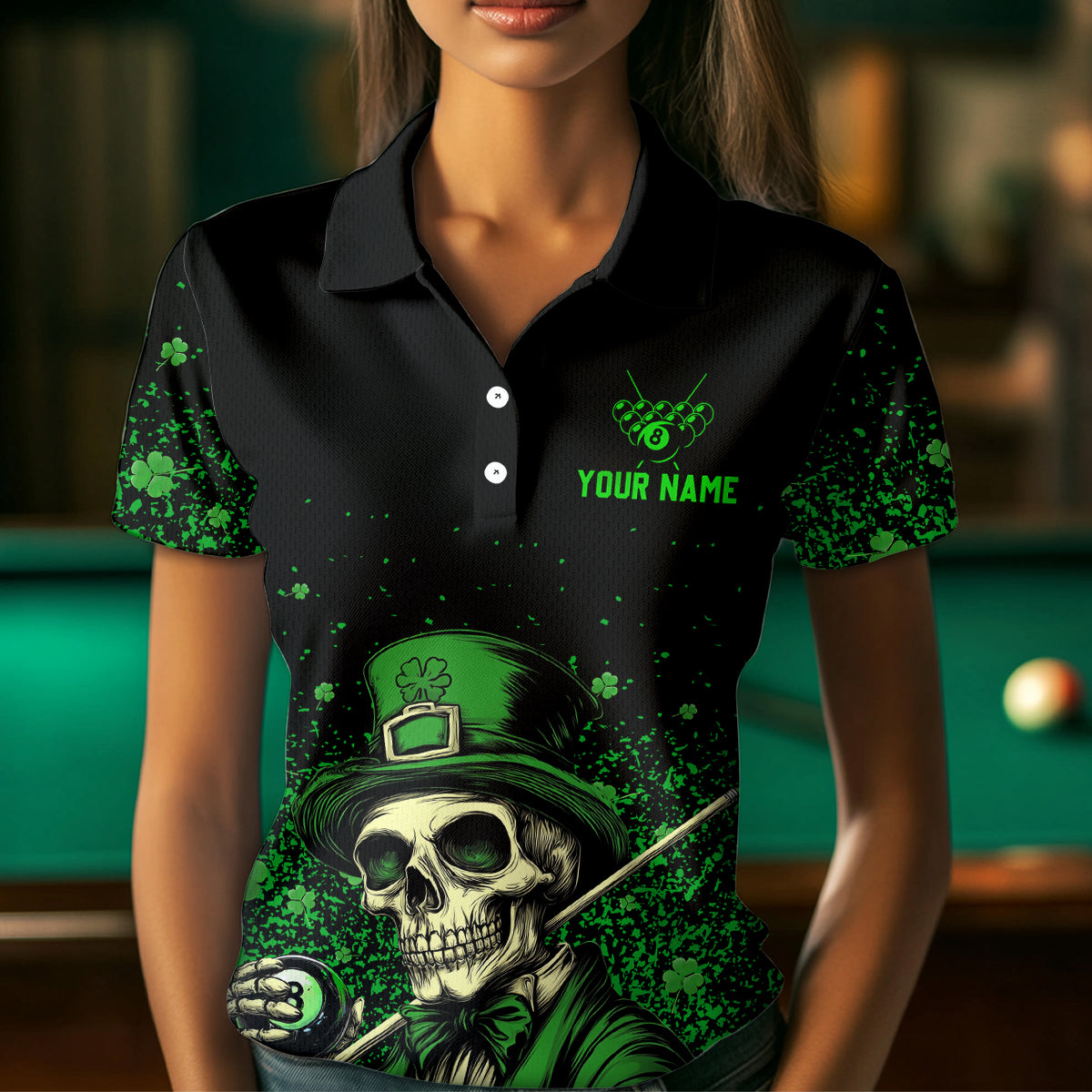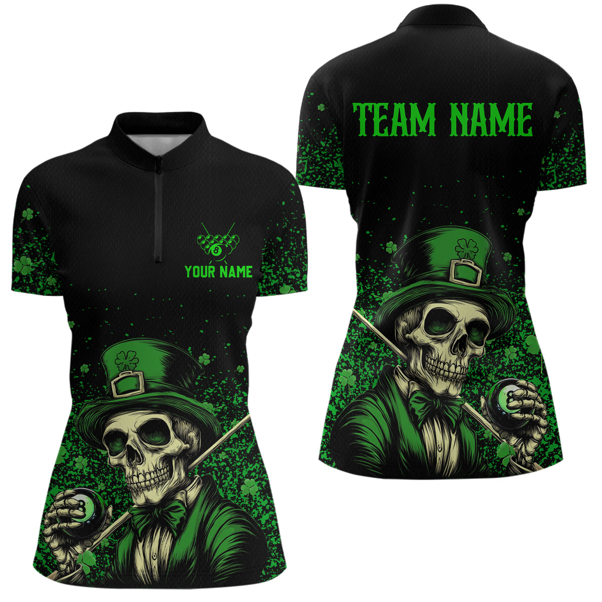 St Patrick Day Funny Skull Ball Billiards Shirt Women Polo & 1/4 Zip Shirts Billiard Team NNT23