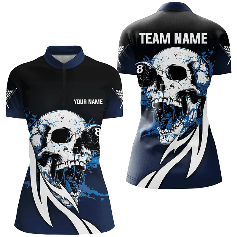 Funny Blue Billiard Skull 8 Ball Pool Custom Women Polo & Quarter-Zip Shirts, Billiard Team Jerseys TDM1805