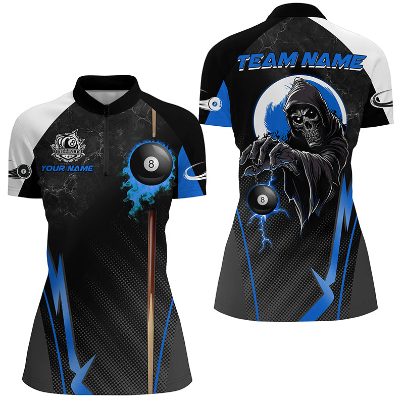Funny Death Skeleton Ball 8 Fire Custom Women Billiard Shirts, Best 8 Ball Pool Jerseys |Blue TDM2035