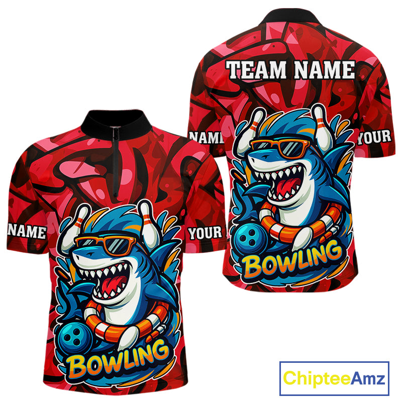 Funny Red Camo Shark Men Bowling Polo, Quarter Zip Shirts Custom Team Shark Bowling Outfit Jersey NQS10076