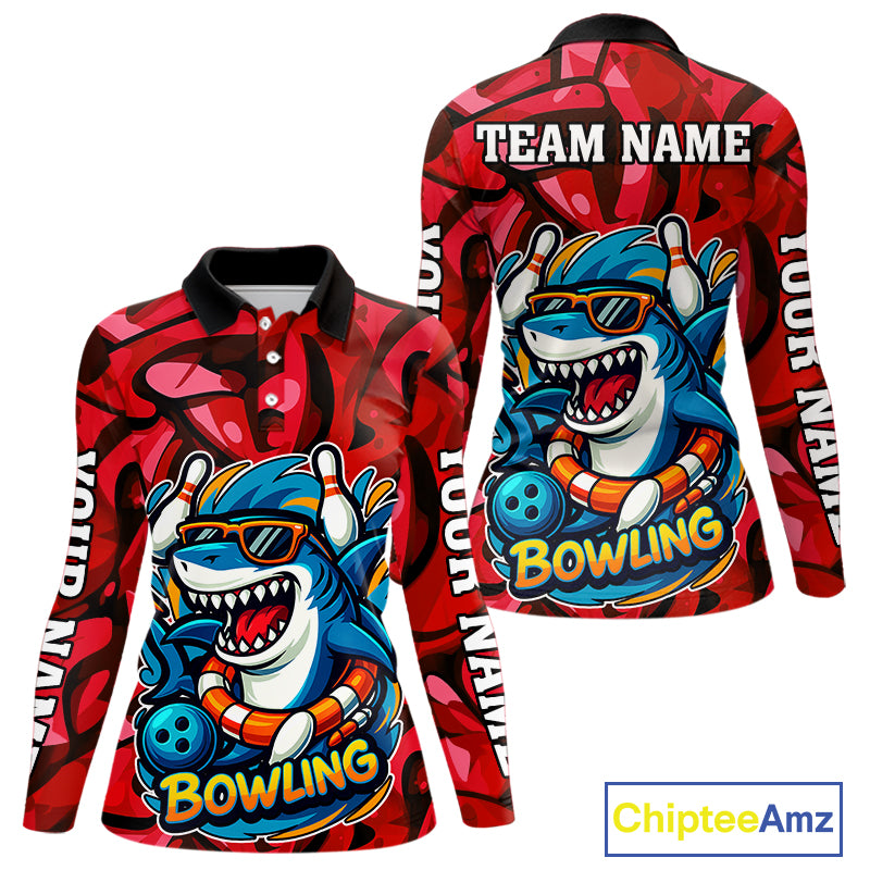 Funny Red Camo Shark Women Bowling Polo, Quarter Zip Shirts Custom Team Shark Bowling Outfit Jersey NQS10076