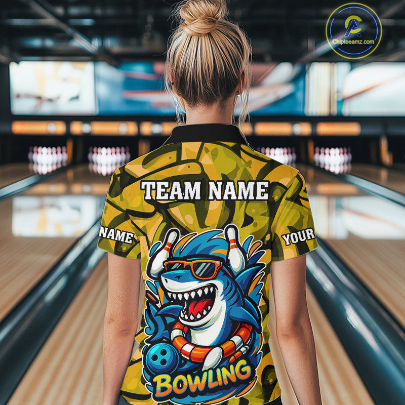 Funny Yellow Camo Shark Women Bowling Polo, Quarter Zip Shirt Custom Team Shark Bowling Outfit Jersey NQS10077