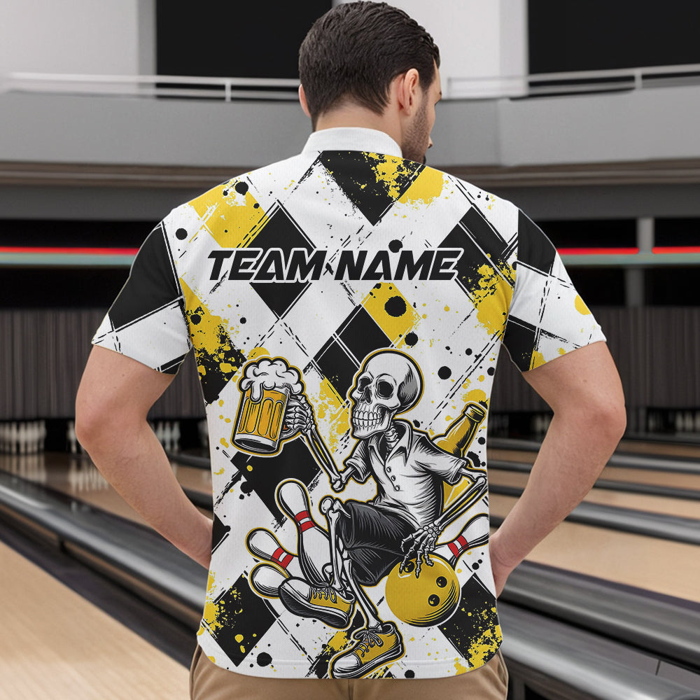 Custom Yellow Argyle Pattern Funny Skeleton Bowling And Beer Men Quarter-Zip Shirts, Team Outfit IPHW8892
