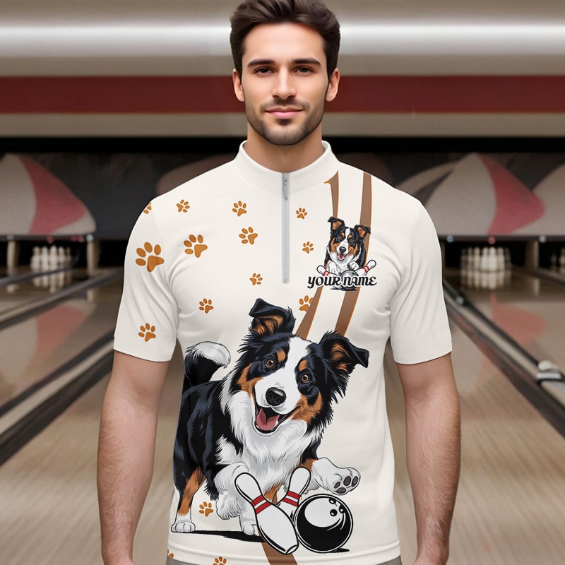 Custom Funny Border Collie Dog Bowling Men Quarter-Zip Shirts, Dog Paw Print Bowler Outfit IPHW8974