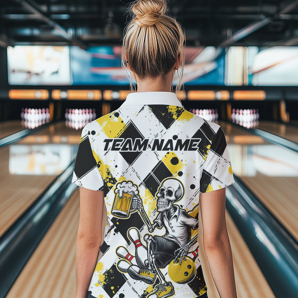 Custom Yellow Argyle Pattern Funny Skeleton Bowling And Beer Women Quarter-Zip Shirts IPHW8892