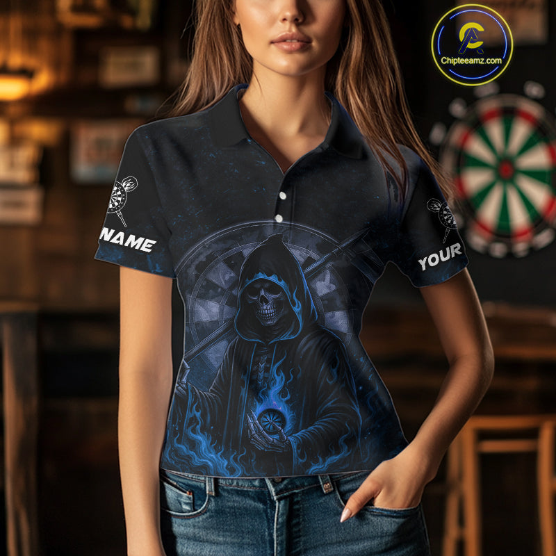 Custom Blue Skull Dartboard Grunge Polo Darts Jerseys For Women, Darts Team Shirt Uniform NYN0870