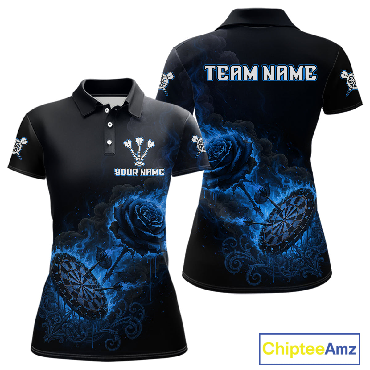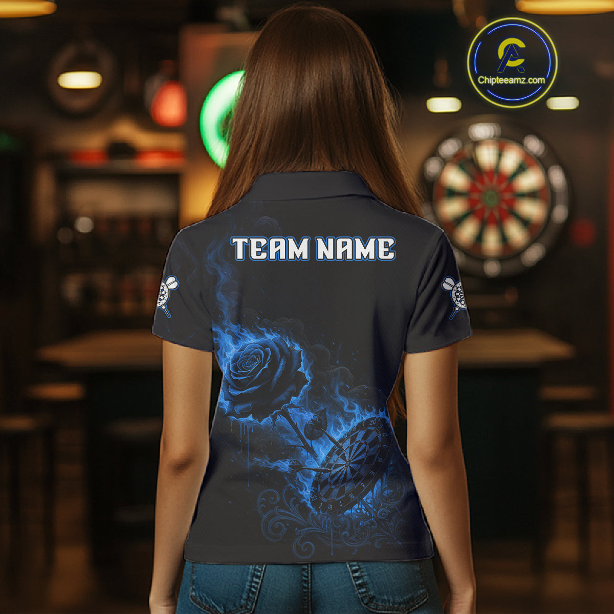 Custom Black And Blue Flames Roses Dartboard Women Darts Polo Shirt, Dart Team Jerseys NYN1846