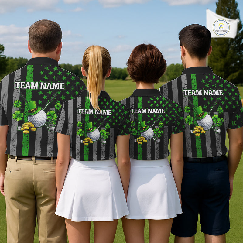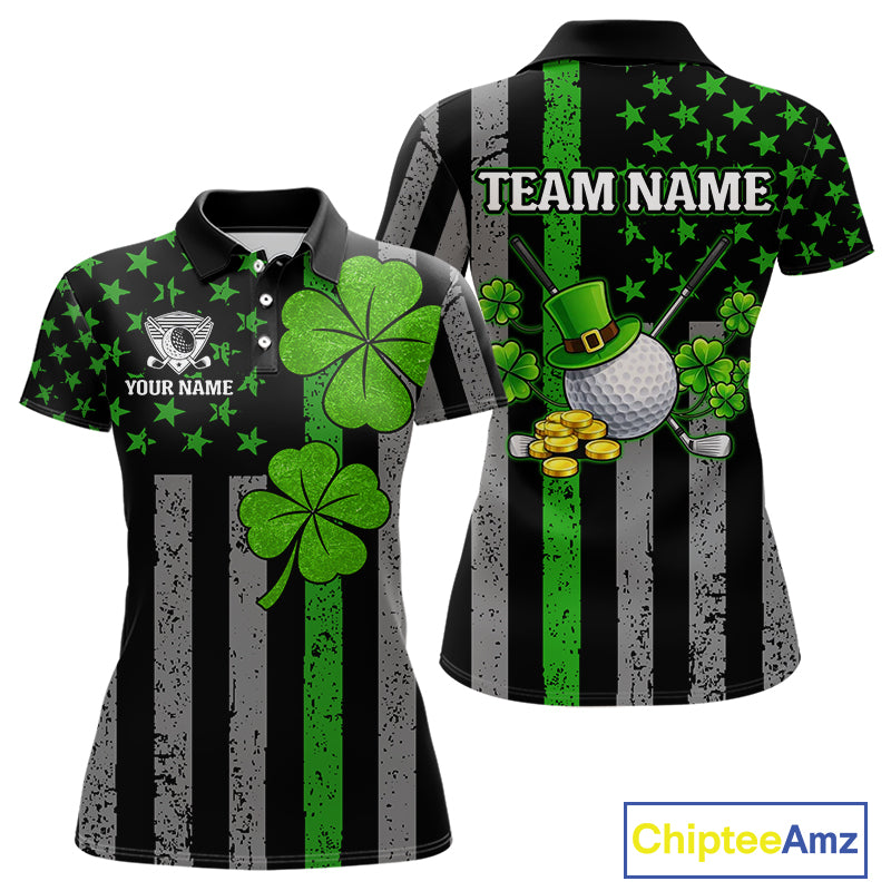 Custom Black Grunge US Flag Patriotic Golf Polo shirt for Women Green Shamrock St Patrick Team Jersey NQS11448