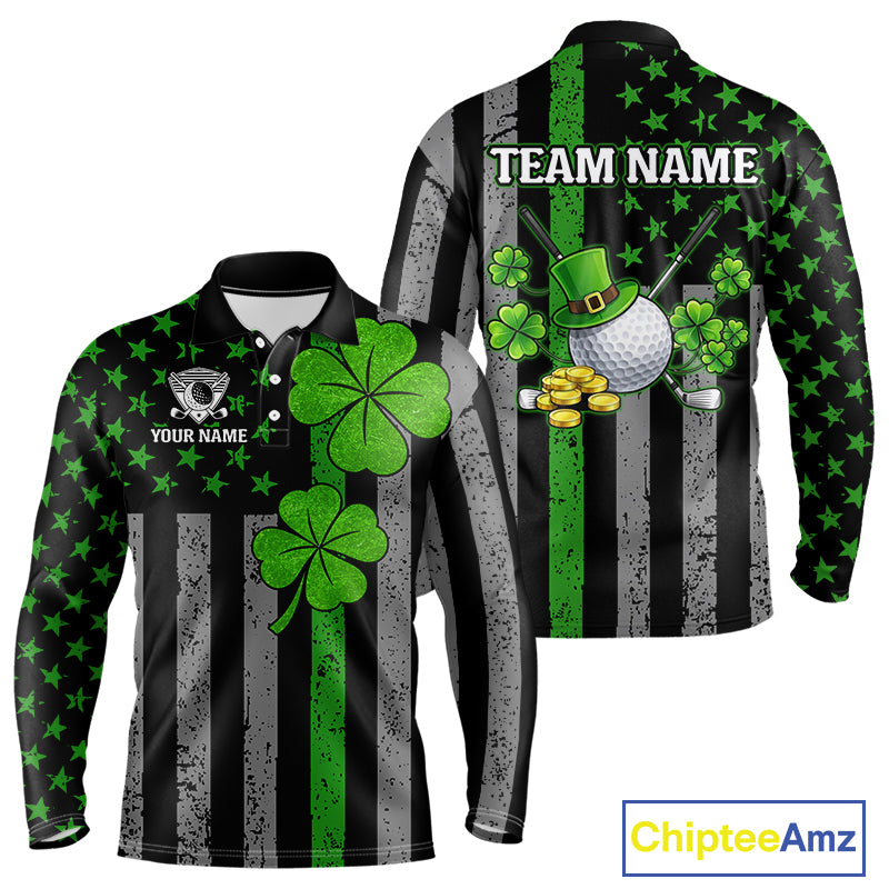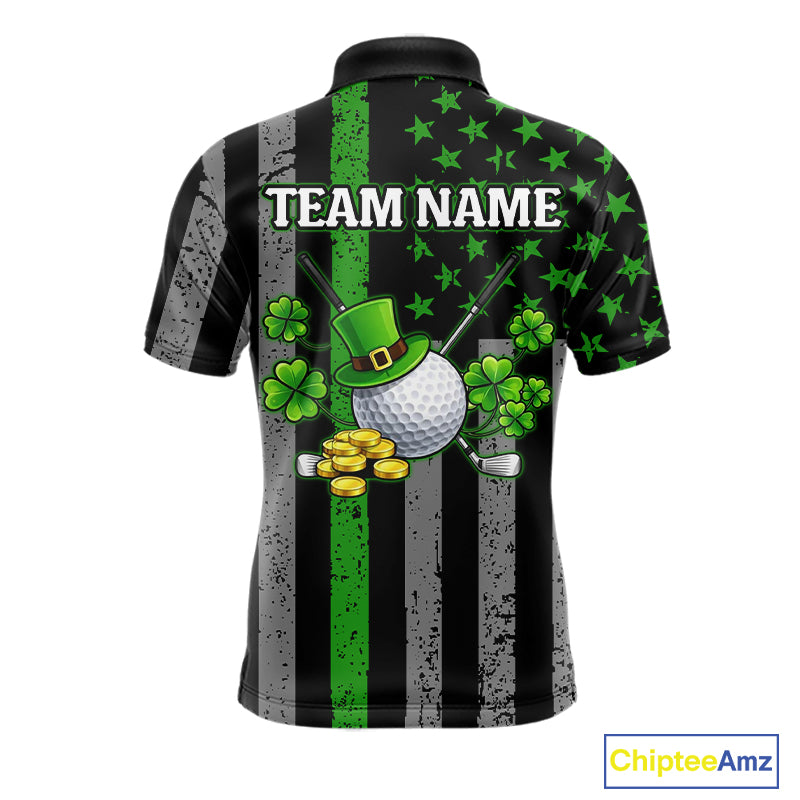 Custom Black Grunge US Flag Patriotic Golf Polo shirts for Men Green Shamrock St Patrick Team Jersey NQS11448