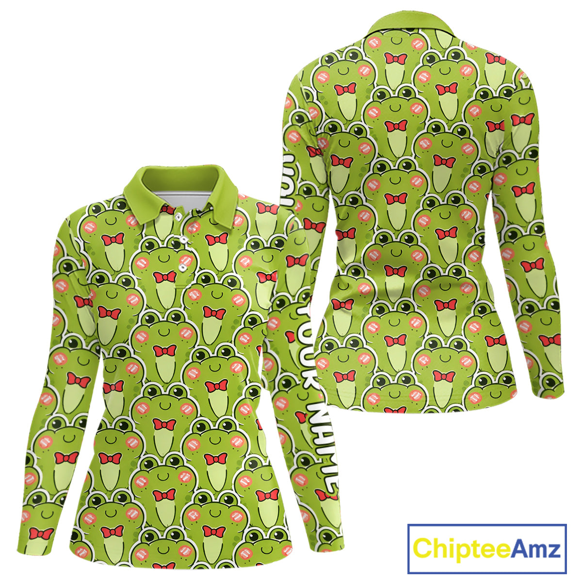 Funny Green Frog Pattern Womens Long Sleeve Golf Polo Shirt Custom Golf Attire For Ladies, Golfer Gift NHN0146