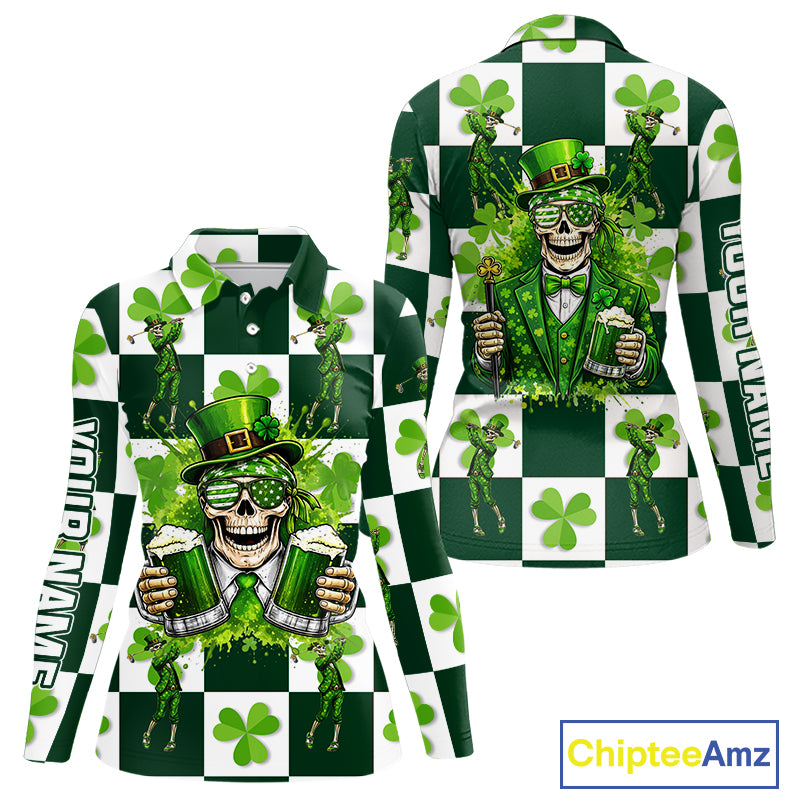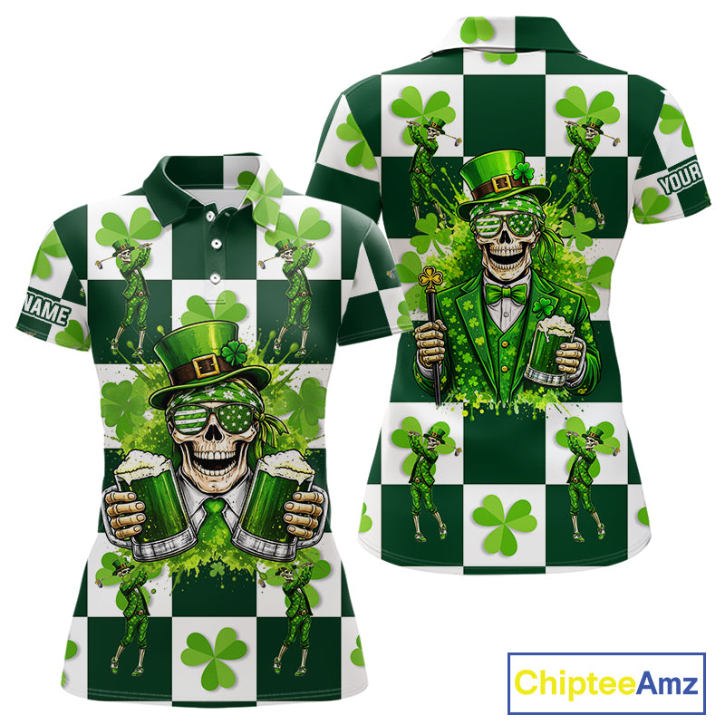 Funny Skull drink beer Clover square pattern Women Golf Polo shirts Custom St Patrick's Day golf tops NQS11454