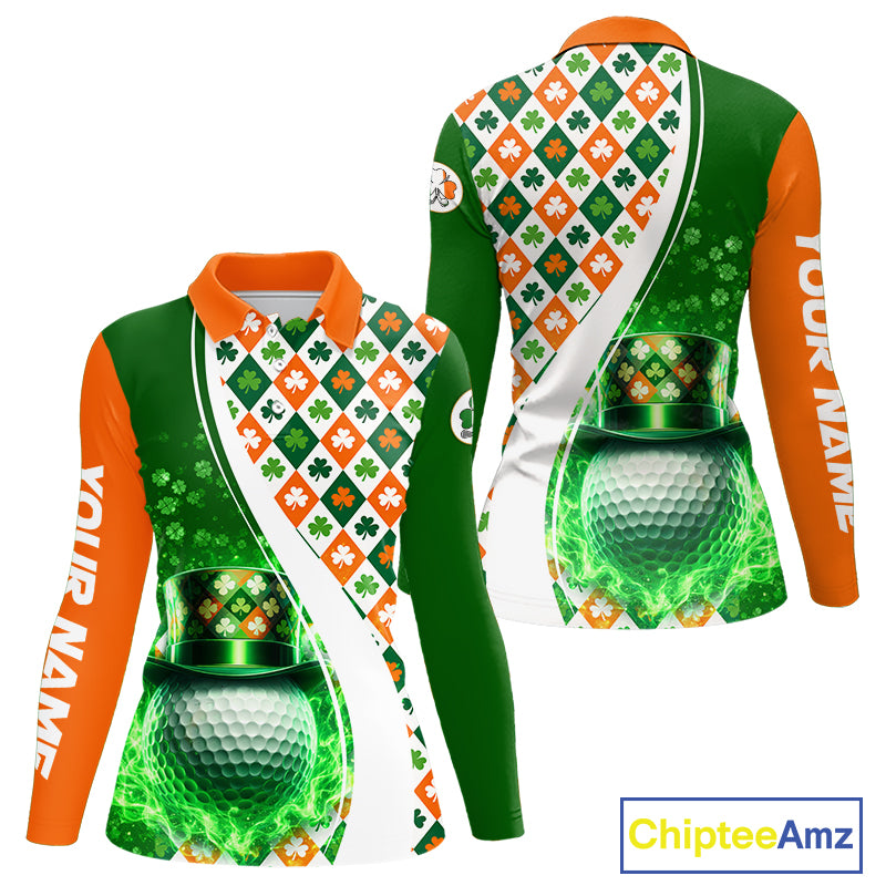 Womens Long Sleeve Golf Polo Shirt Custom Green Clover St Patricks Day Plaid Pattern Ireland Flag NHN0142