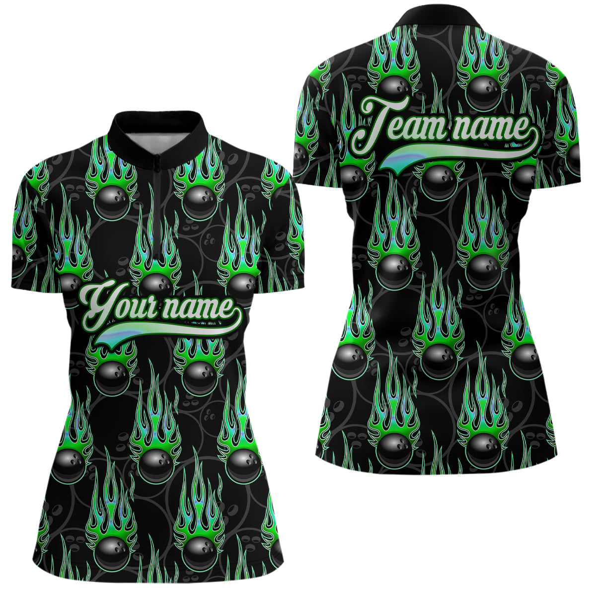 Black Bowling Ball Camo Green Flame Bowling Polo, 1/4 Zip Shirt for Women Custom Bowling Team Jersey NQS9479