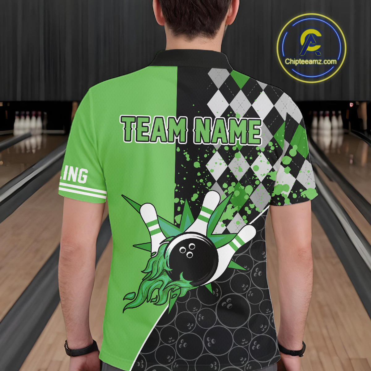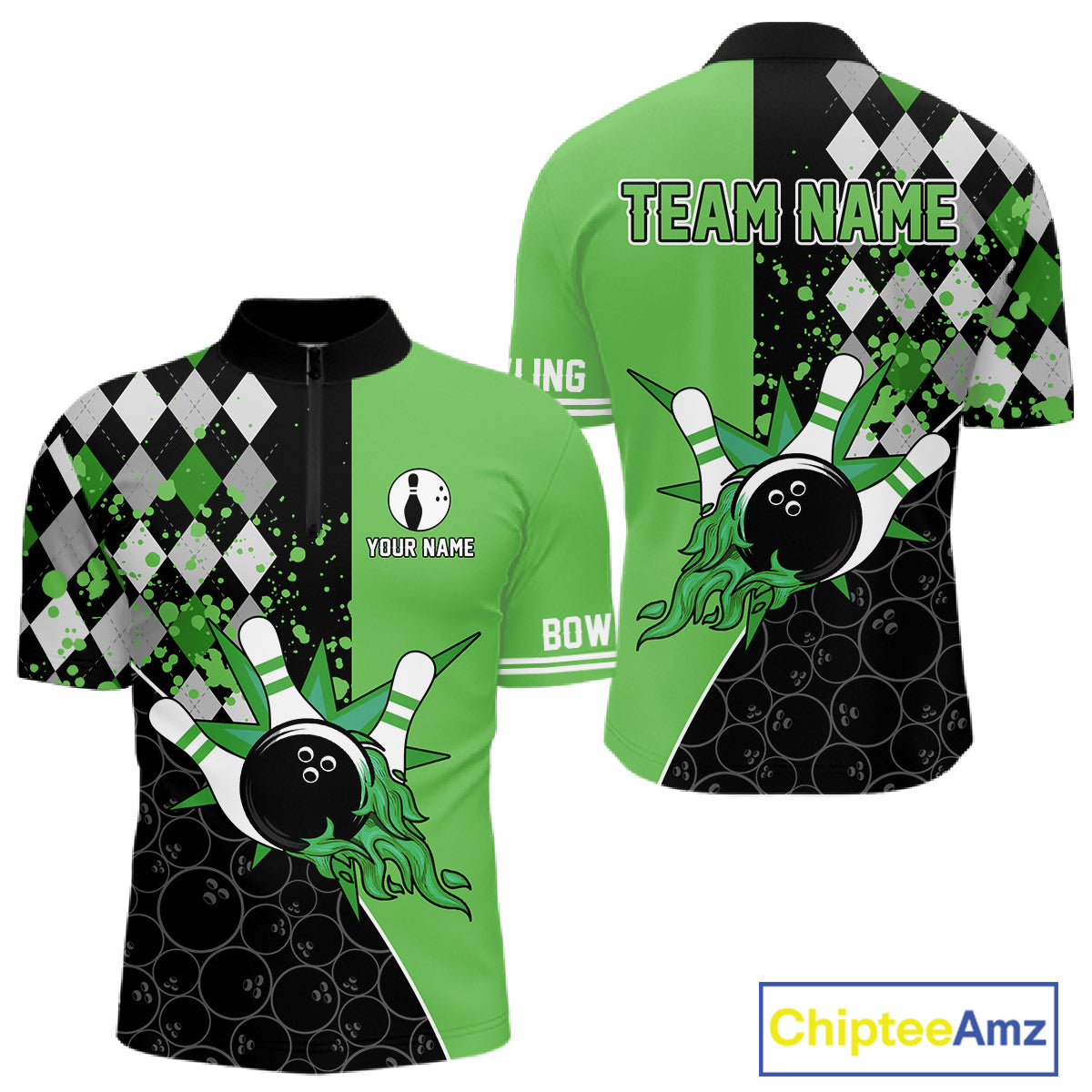 Custom Black and Green argyle pattern flame Bowling Team Jerseys, Bowling Polo, 1/4 Zip Shirt for Men NQS10450