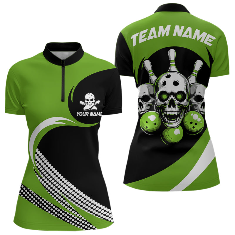 Custom Green Skull Bowling Shirt Quarter-Zip Bowling Jersey for Men Women Bowling Outfit QZT671