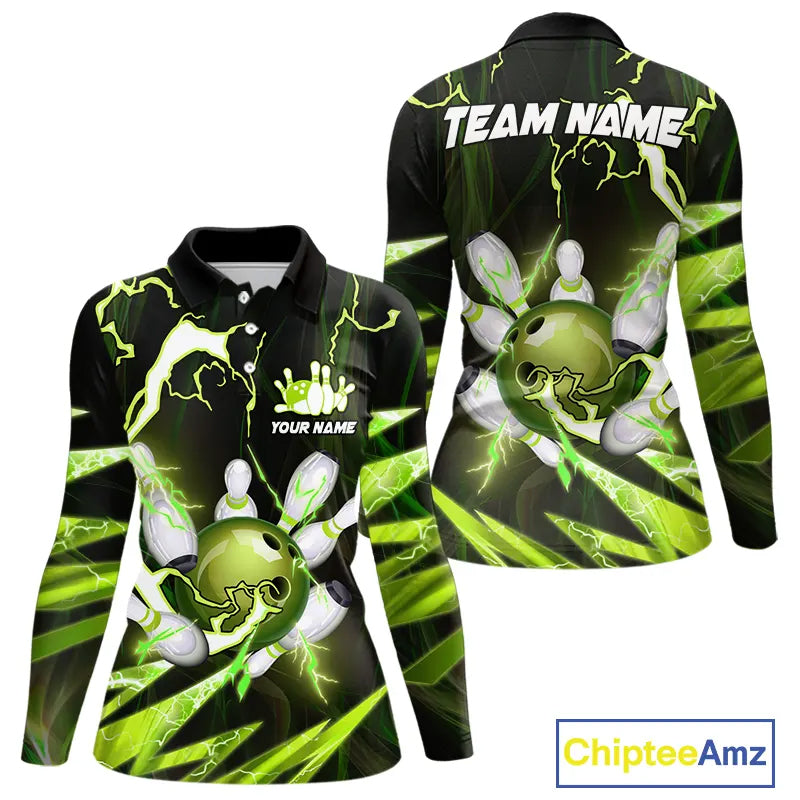 Green Thunder Lightning bowling ball and pins jersey Custom Team Bowling Polo, 1/4 Zip Shirt For Women NQS9832