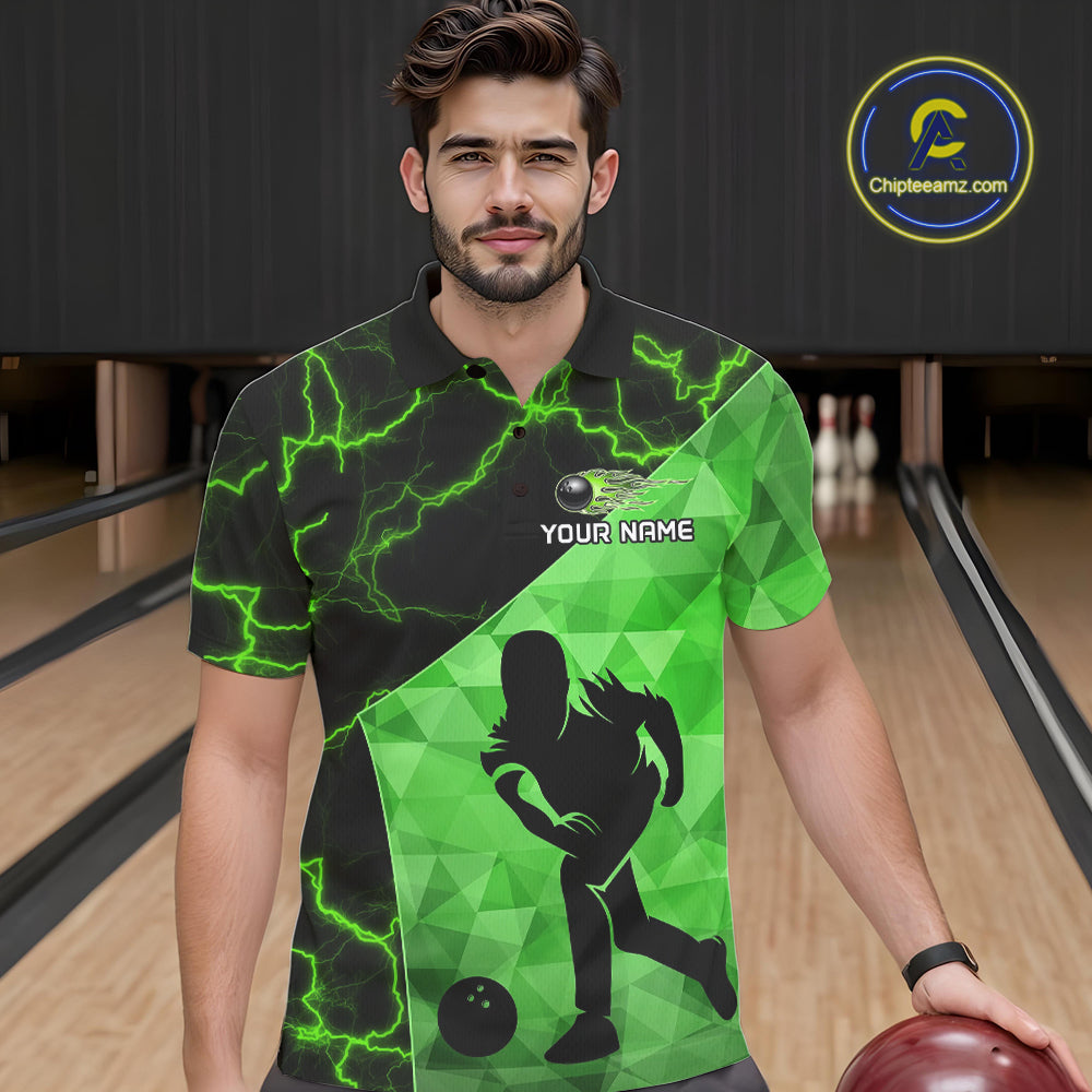 Green Thunder Lightning Bowling Polo, Quarter Zip Shirts For Men Custom Team Bowling Outfit NQS10821