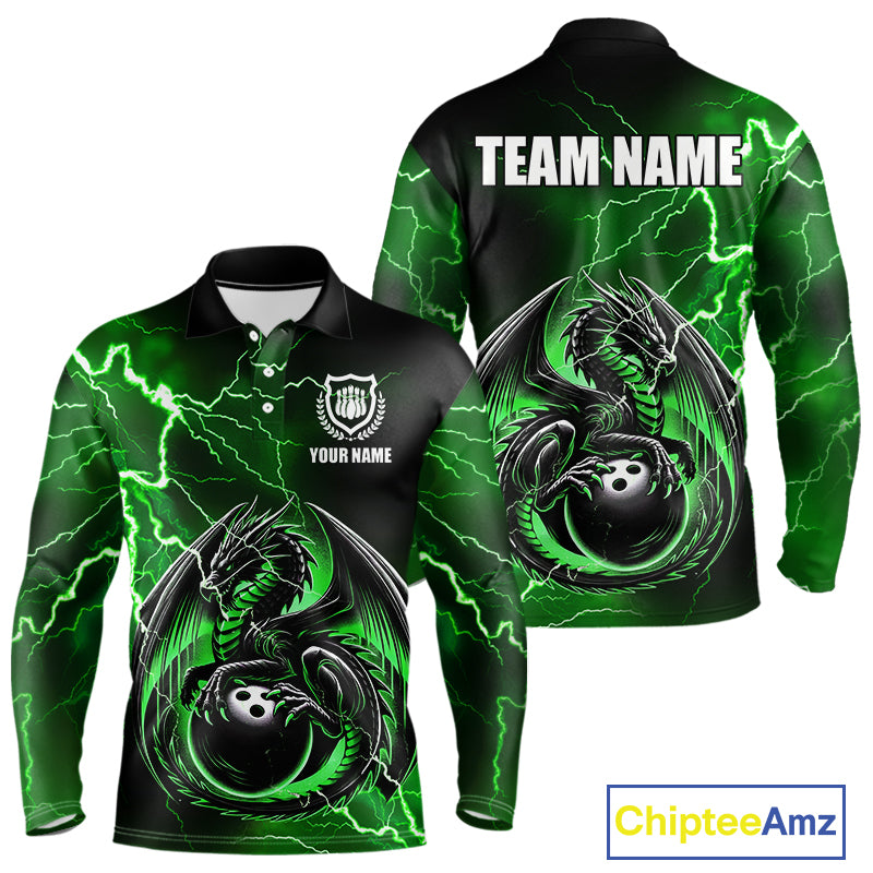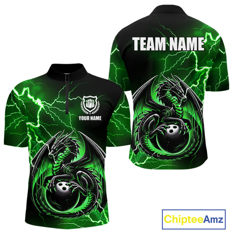 Personalized Black And Green Thunder Lightning Dragon Bowling Shirts For Men, Bowling Team Uniform NQS10296