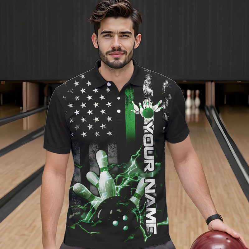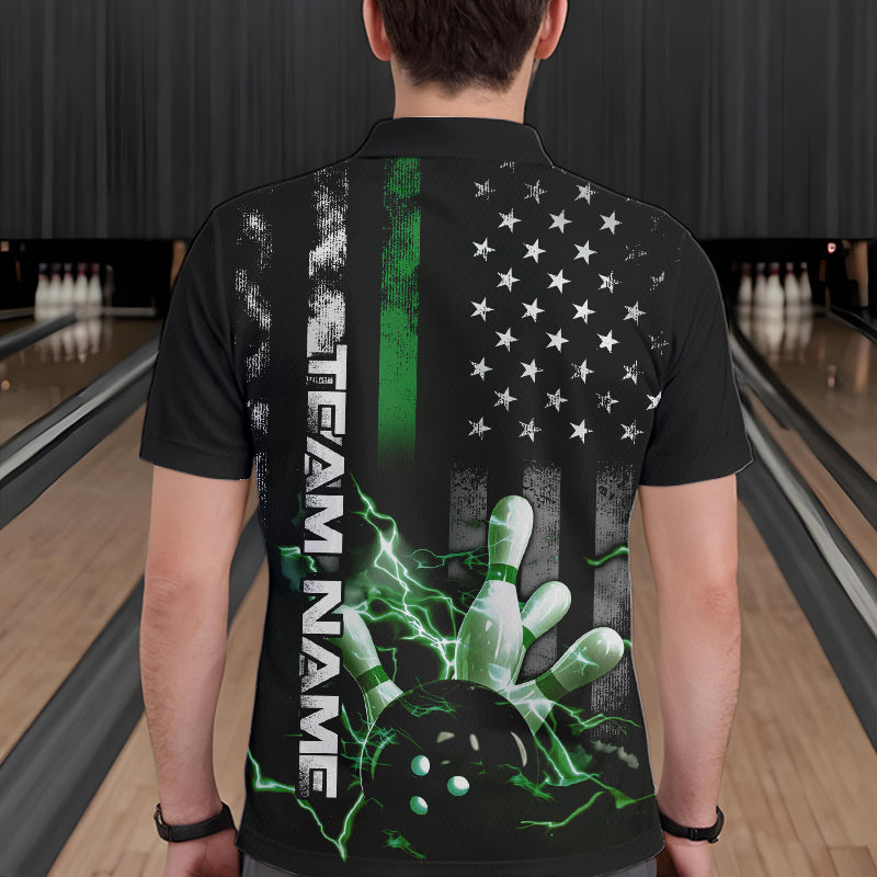 Custom Black And Green Thin Line American Flag Patriotic US Bowling Team Polo Shirts For Men IPHW8519