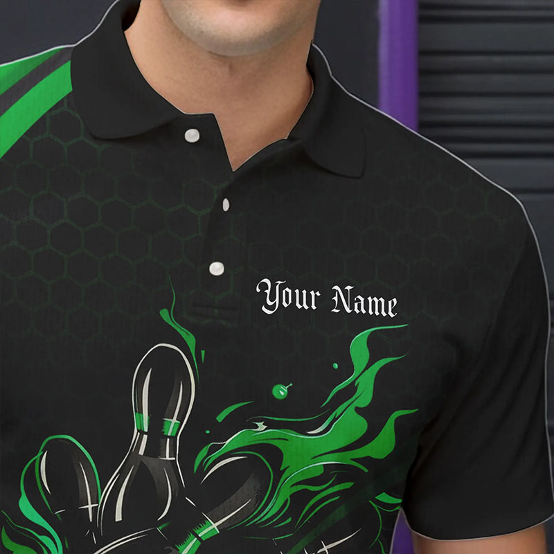 Custom Black And Green Flame Bowling Polo Shirts For Men, Bowling Tournament Team Shirts IPHW8545