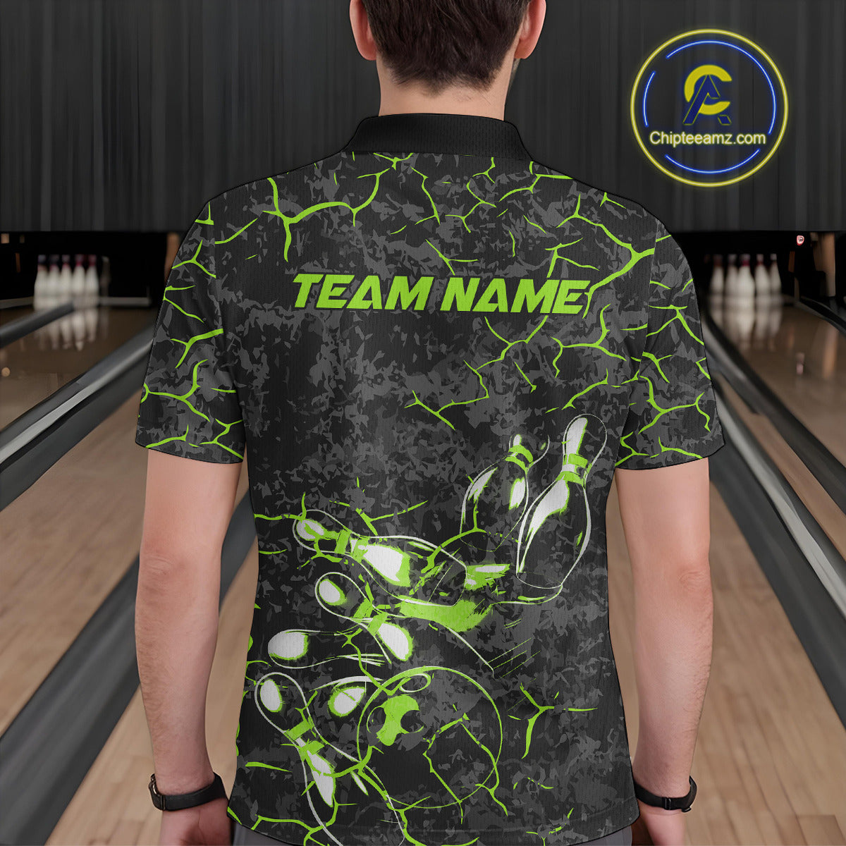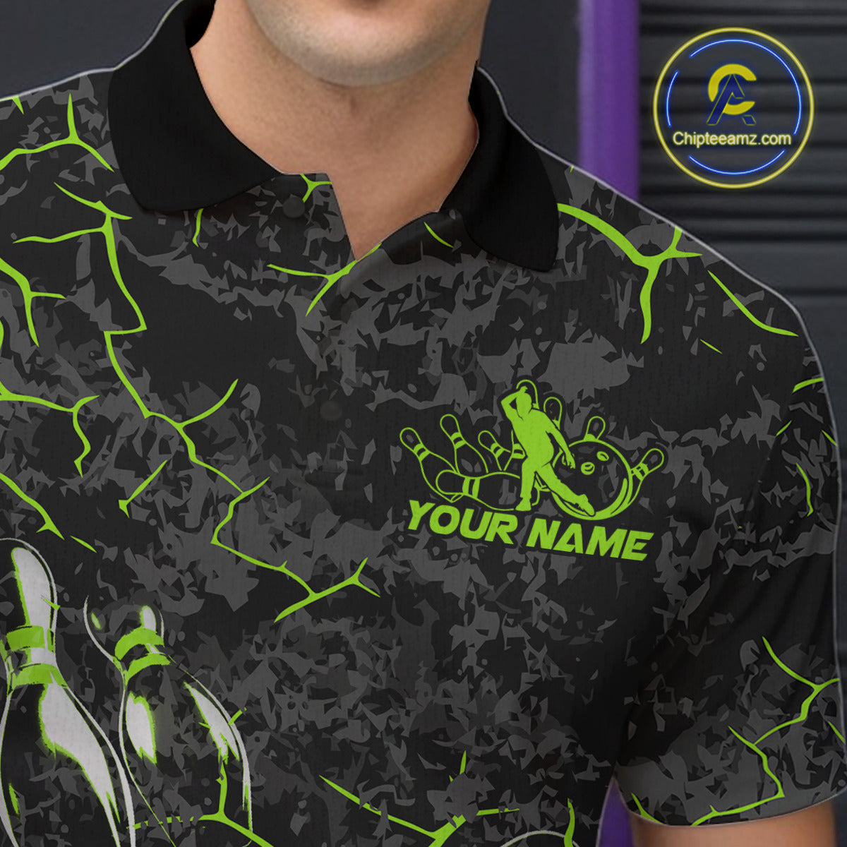 Custom Black And Green Camo Bowling Team Polo Shirts For Men, Bowling League Shirt IPHW9372