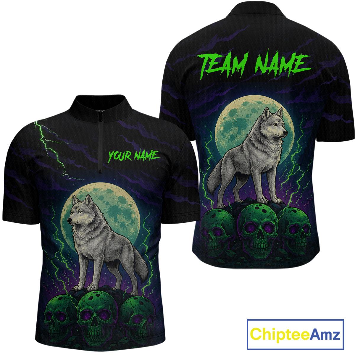 Purple And Green Wolf & Skull Bowling Team Shirt for Men Custom Bowling League Jersey Bowling Unisex QZT732