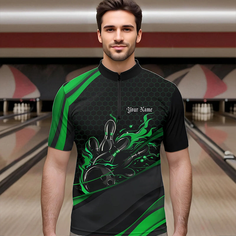 Custom Black And Green Flame Bowling Quarter-Zip Shirts For Men, Bowling Tournament Team Shirts IPHW8545