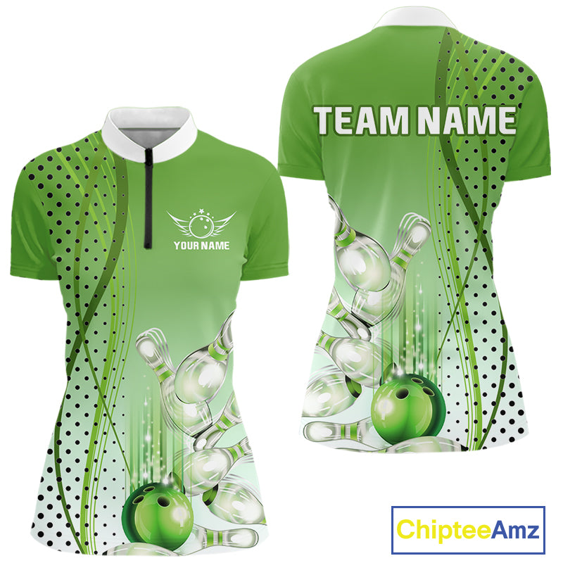 Women bowling polo, quarter zip shirts Custom bowling team jerseys, gift for Bowlers | Green NQS10072