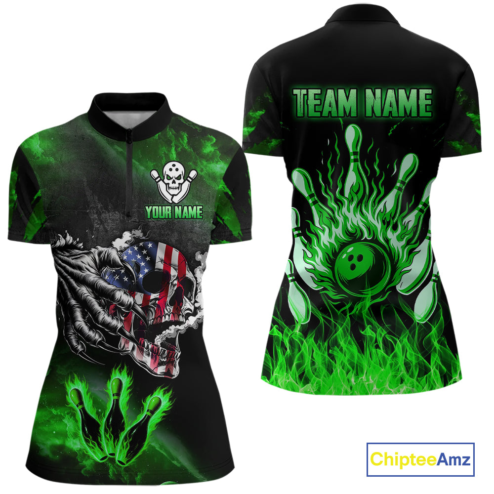 Green Flaming American Flag Skull Bowling Shirt For Women Custom Fire Bowling Team Jersey TDM4656