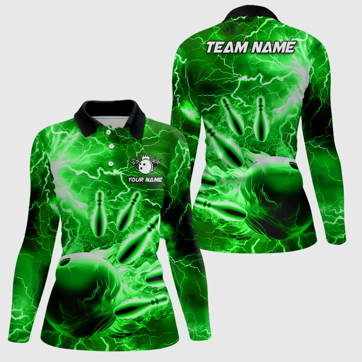 Womens polo bowling shirts Custom green lightning thunder Bowling Team Jersey, gift for team Bowlers NQS7143