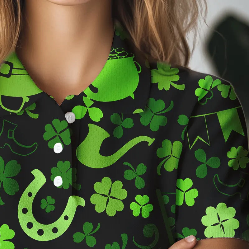 Green shamrock St Patrick Day pattern Lucky polo golf shirts for Women Custom St Patrick golf attire NQS9649