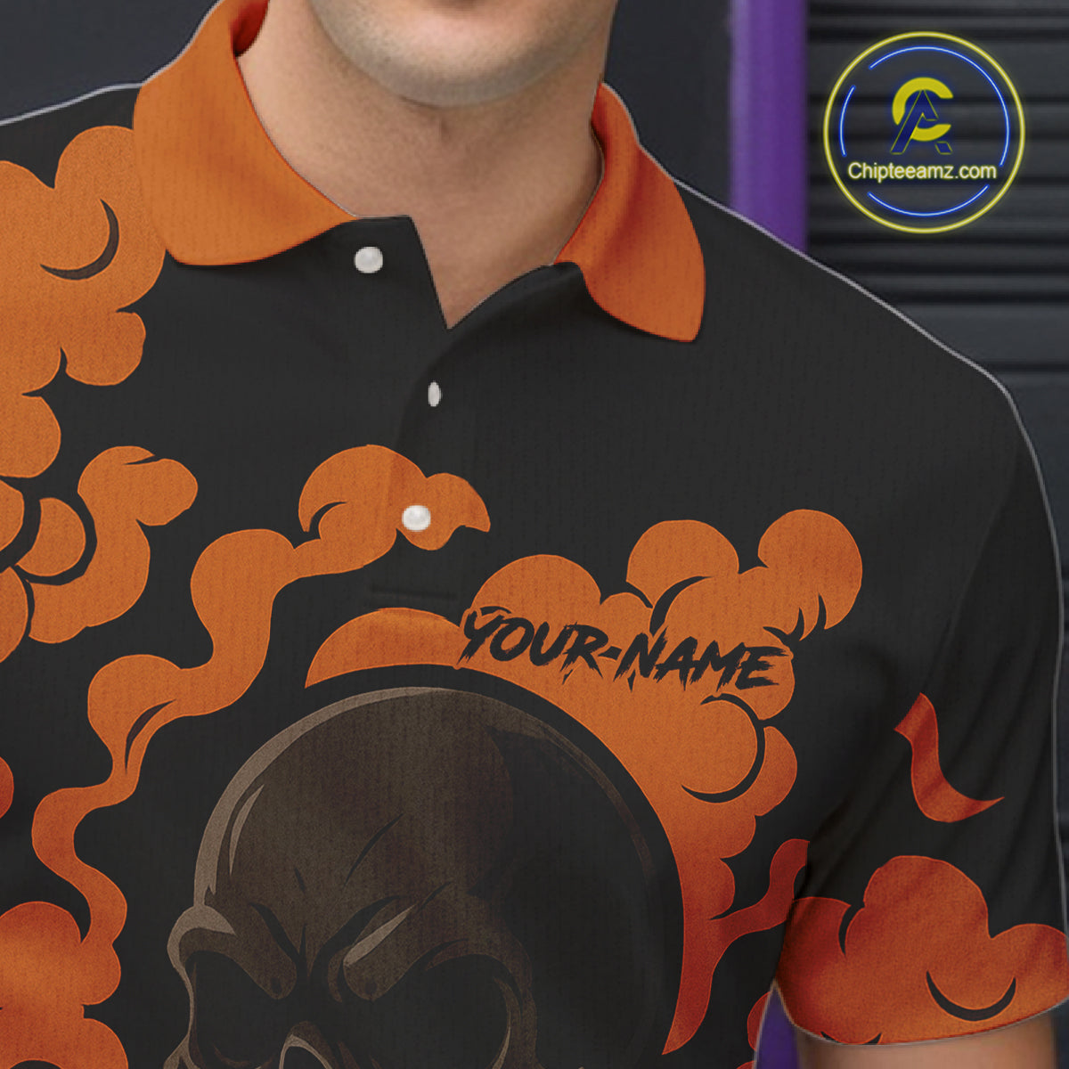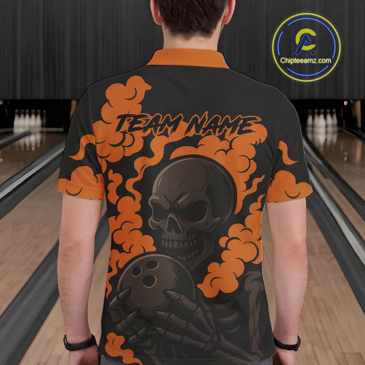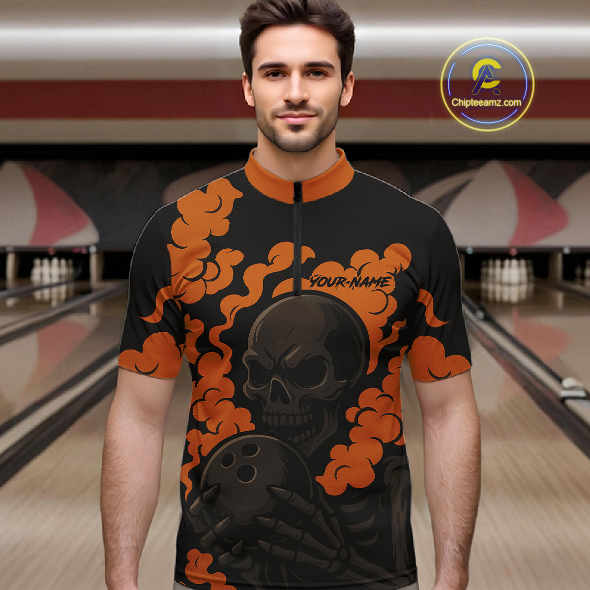Custom Black and Orange Skull Team Bowling Polo, 1/4 Zip Shirts For Men, Halloween Bowling Outfits NQS10621